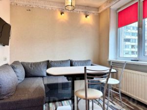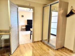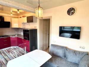 Общая площадь 45,6 кв.м. + неостеклённый балкон 4 кв.м. Большая светлая кухня с двумя окнами площадью 13,6 метров, в ней расположен раскладной угловой диван (можно использовать его как второе спальное место). В комнате (18,7 кв.м.) - двуспальная кровать, вместительный шкаф-купе, тумба с ящиками. Раздельный санузел.