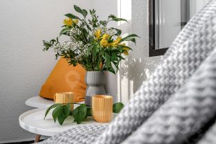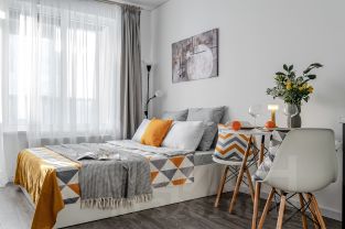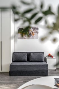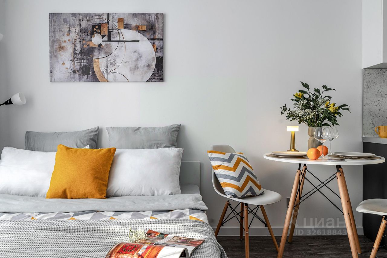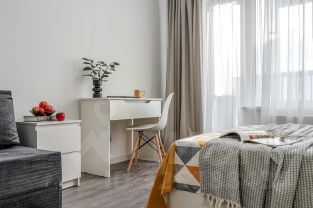 Мебель: удобная кровать с ортопедическим матрасом, раскладной диван, кухня, обеденная зона, рабочий стол, вместительные шкафы.