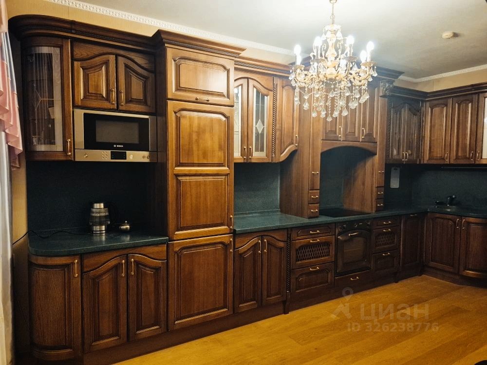 - Кухня 13,4 кв.м.: кухонный гарнитур деревянный массив, встроенный холодильник, посудомоечная машина, электрическая варочная панель 4 конфорки, встроенная электрическая духовка, встроенная микроволновка, электрический чайник, на полу паркет;