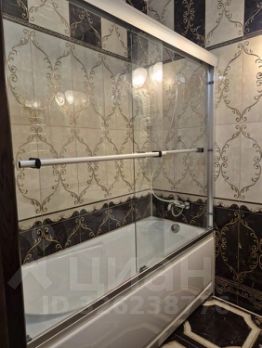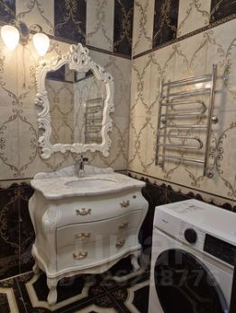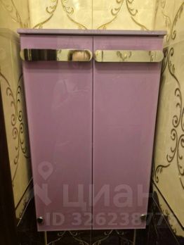 - Ванная комната 4 кв.м.: ванна со стеклянной шторой, раковина с тумбой, зеркало, стиральная машинка, на полу и стенах плитка;