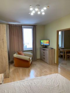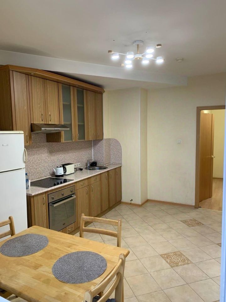 В квартире выполнен евро ремонт. Просторная кухня площадью 14 м² оснащена необходимой бытовой техникой, включая холодильник и микроволновую печь. Из мебели — вместительные шкафы и удобный диван.