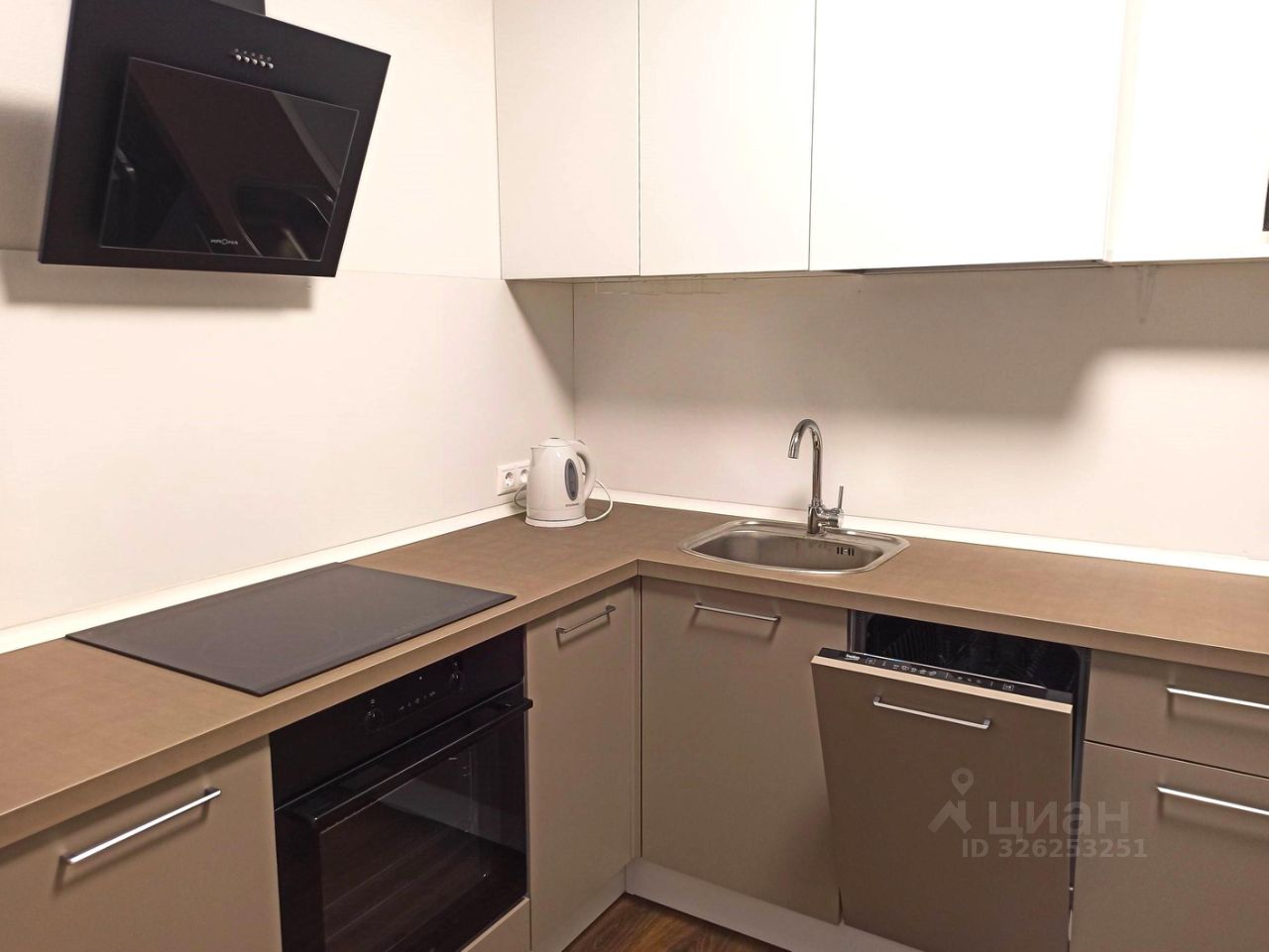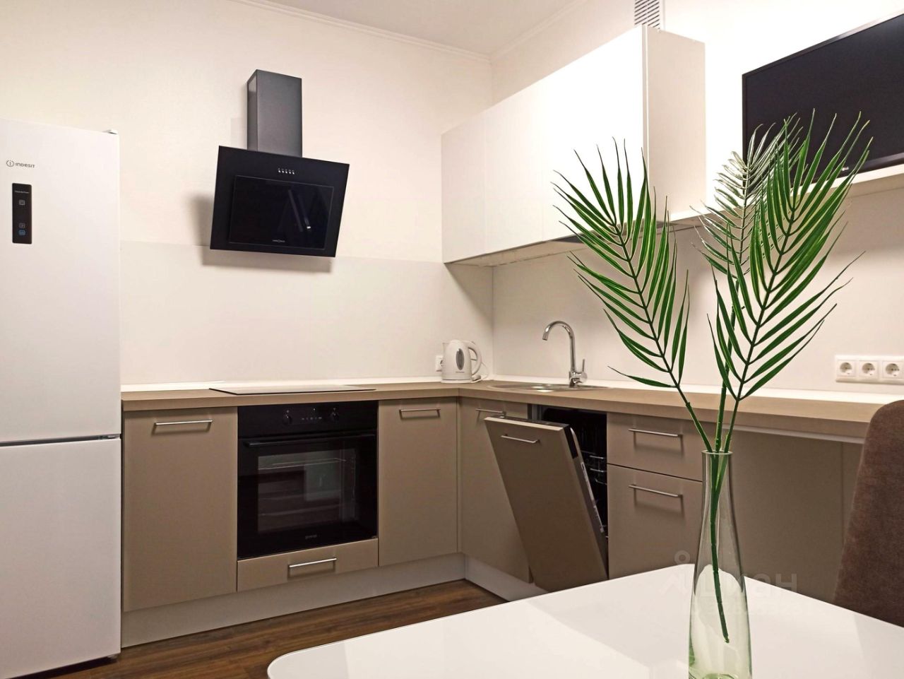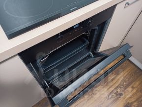 Встроенная бытовая техника: посудомоечная машина, варочная поверхность, духовой шкаф, вытяжка, а также холодильник.