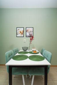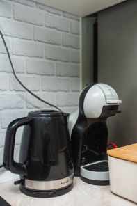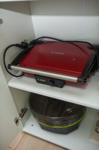 - наполненная кухня: гарнитур с посудой, плита, микроволновка, холодильник, чайник, капсульная кофемашина, встроеный фильтр, гриль, сушилка для овощей, телевизор;