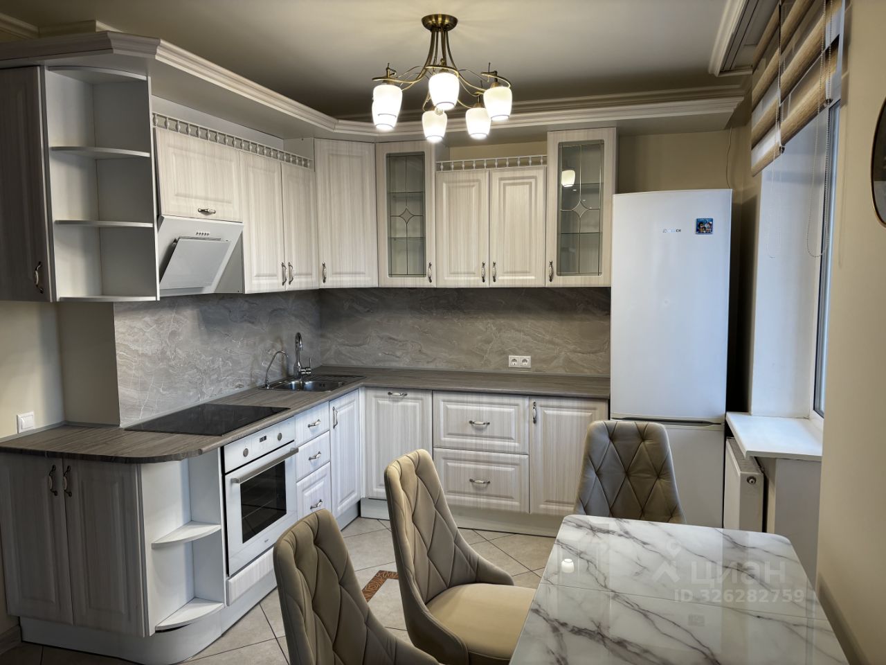 Кухонная зона: Угловой гарнитур с современной техникой: варочная панель Kuppersberg, духовой шкаф Whirpool, вытяжка, посудомоечная машина, холодильник Bosch и множество шкафов. Есть выход на застеклённую лоджию (отличная кладовка или место для чашки кофе).