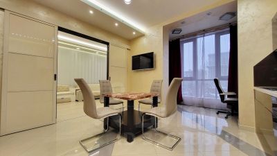 В квартире есть вся необходимая мебель и техника для комфортного проживания, теплые полы, система очистки воды, кондиционер. Полностью оборудованная кухня: индукционная варочная панель, вытяжка, духовой и паровой шкафы, холодильник, микроволновка, электрический чайник, диспоузер (измельчитель пищевых отходов).