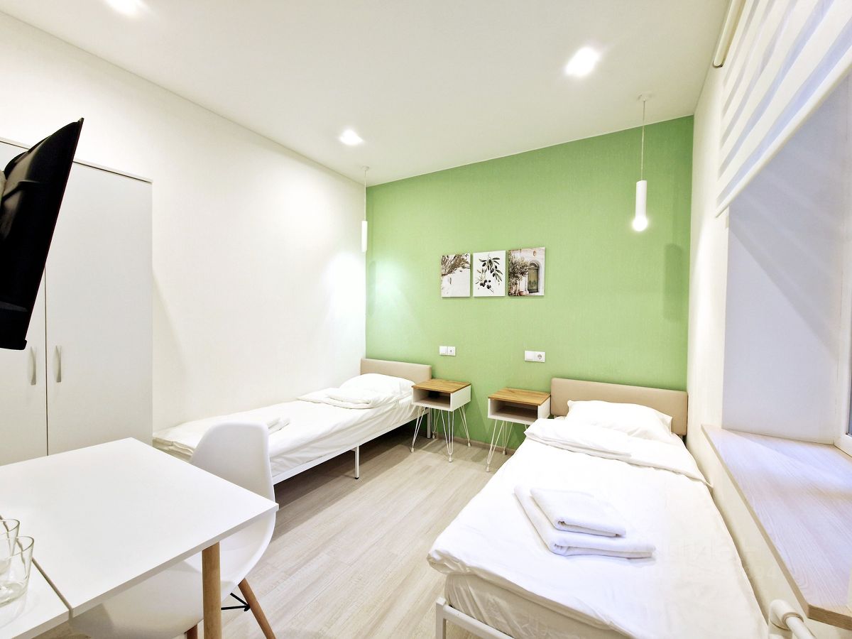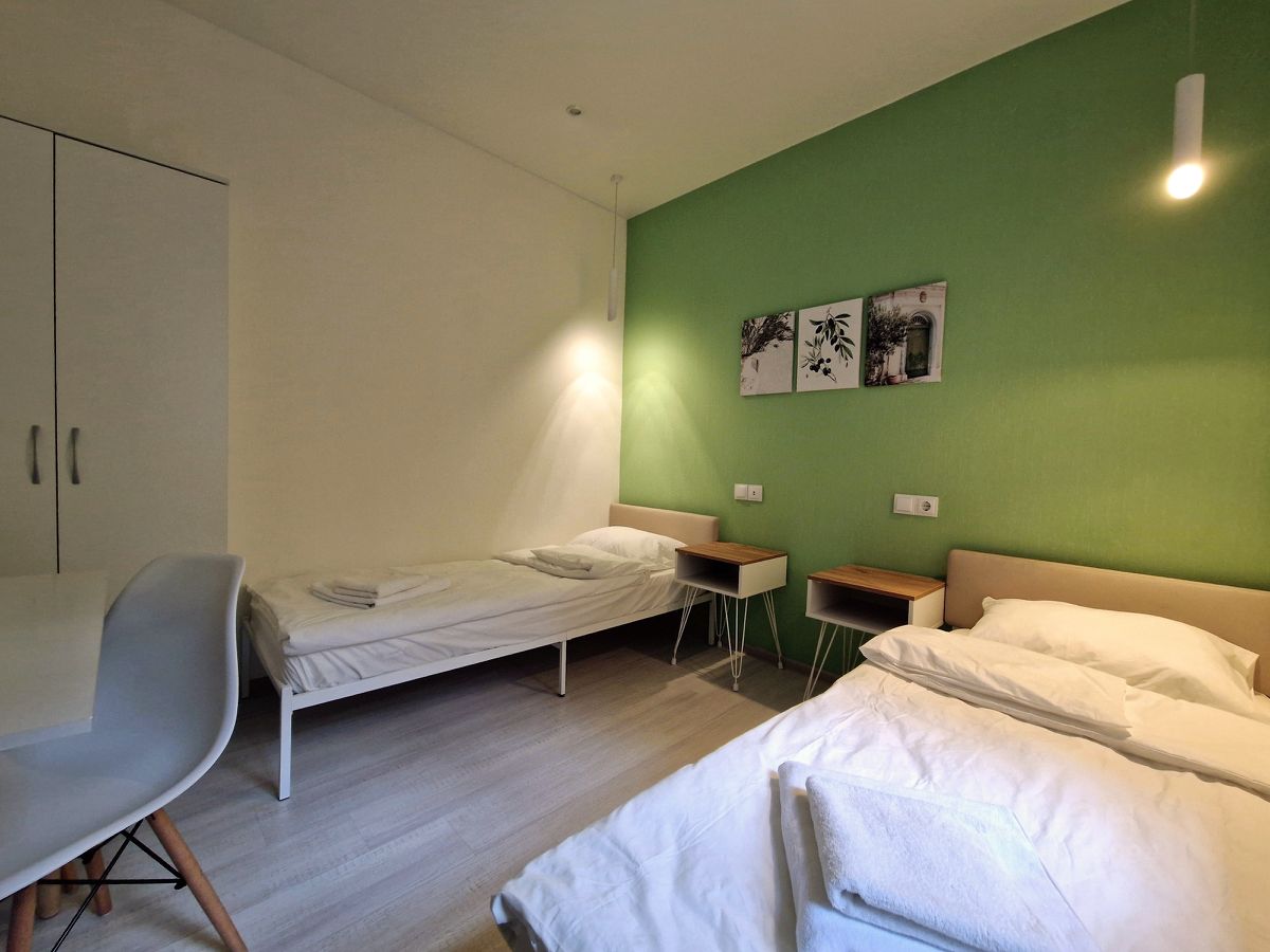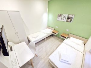Для комфортного проживания в студии имеется мини кухня с холодильником, чайником и электрической варочной панелью, в комнате установлена вся необходимая мебель с двумя очень удобными односпальными кроватями с качественными ортопедическими жесткими матрасами и чистым постельным бельем, есть ЖК телевизор с цифровыми каналами.