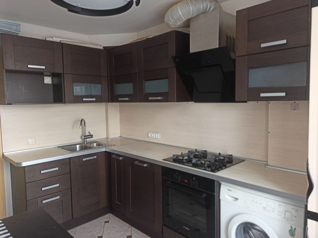 на кухне вся необходимая бытовая техника - варочная поверхность, духовой шкаф, посудомоечная машина, холодильник, стиральная машина, вытяжка.