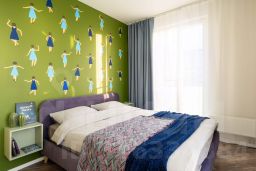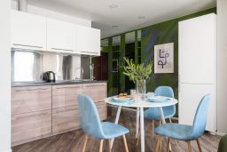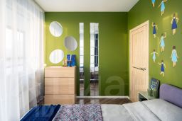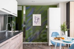 Ярким дизайнерским решением стала роспись на стенах: танцующие фигурки в спальне и загадочный узор минерала в прихожей. Лейтмотивом квартиры стал глубокий травяной зеленый цвет, к которому дизайнеры добавили в каждой комнате что-то свое: в кухне - стулья небесного голубого оттенка, в спальне - декор глубоких синих тонов, в гостиной - диван приглушенного цвета хаки. Квартира получилась свежей и дерзкой, как солнечный весенний денек.