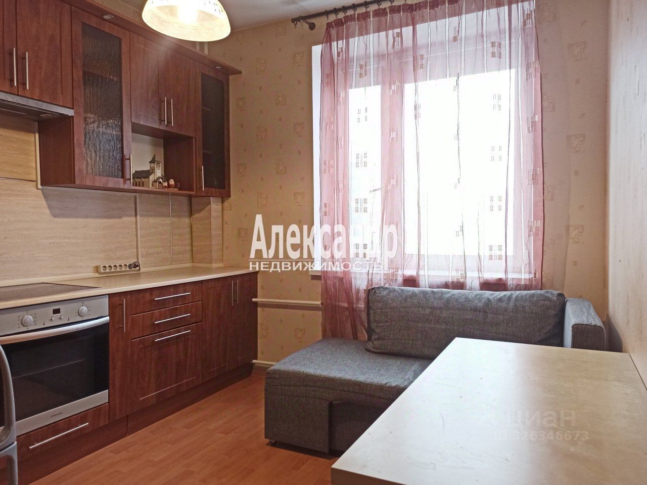 Просторная комната, удобная прихожая, раздельный санузел, кухня со встроенной мебелью на которой установлен диван.