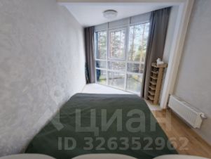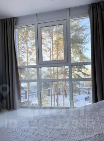 В квартире двухместная кровать, диван-кровать и второй раскладной диван в кухне-гостиной может служить дополнительным спальным местом. Спальная зона с панорамным окном в пол с видом на реликтовые сосны и финский залив.