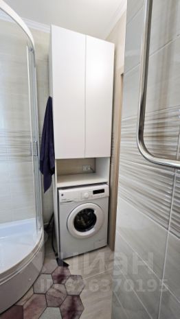 - Полноценный санузел с необходимой сантехникой и душевой кабиной, а также стиральная машина, шкафы, зеркало, сушилка.