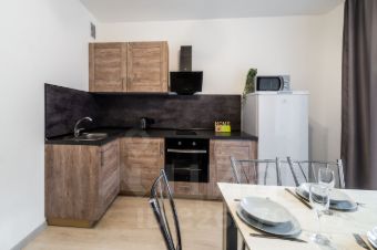 - Кухонный гарнитур с варочной поверхностью, холодильником, чайником, духовым шкафом, набором посуды для готовки и сервировки