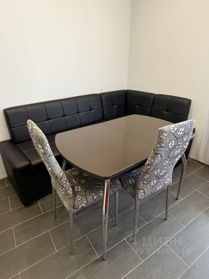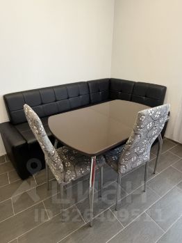 На кухне 2-местный диван из эко кожи, холодильник, электроплита с духовым шкафом, вытяжка, посудомойка, новый электрочайник, шкафы для хранения, стол и стулья.