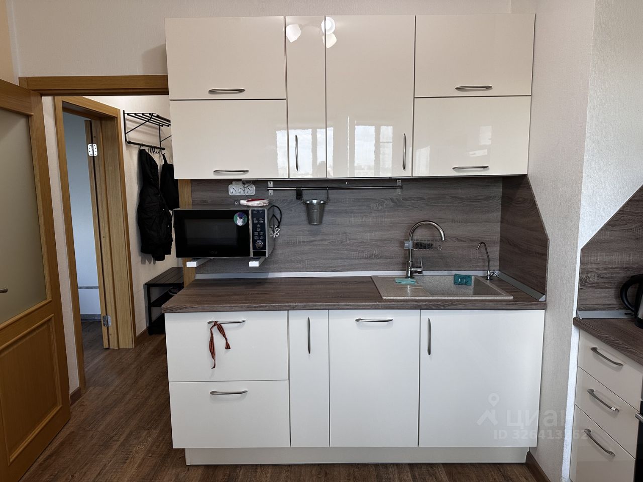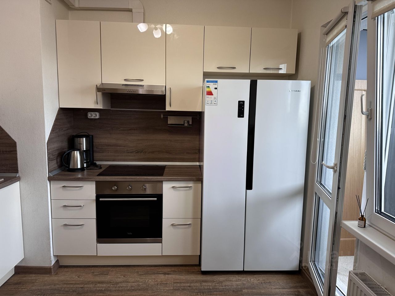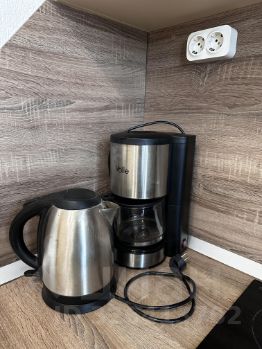 Кухня дорогая, под заказ, 2х дверных холодильник. Стол и 2 стула Икея. Есть чайник, кофемашина, микроволновка, посудомойка, встраиваемая техника, пылесос, утюг, сушилка металлическая, полотенцесушитель.