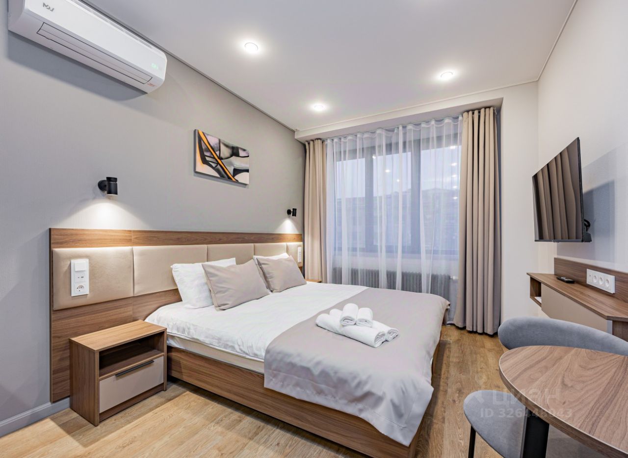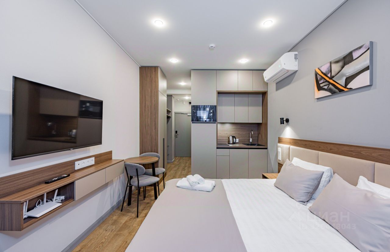 Ремонт в современном стиле, новая мебель и техника, есть кондиционер, посудомоечная машина, smart TV. Есть зонирование между спальной и кухонной зонами. В стоимость включены две поддерживающие уборки с заменой постельного белья и полотенец в месяц.
