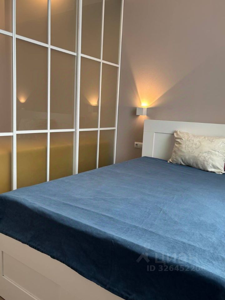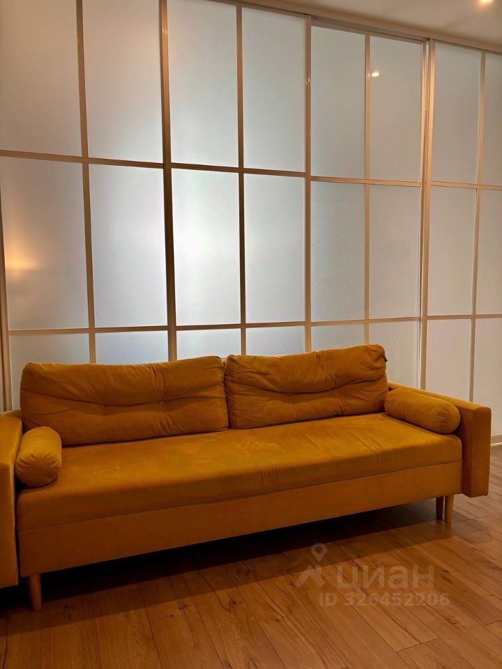 Комната (21.6 м²): Пространство грамотно зонировано стеклянной перегородкой. Выделена спальня с двуспальной кроватью и гостиная с диваном и ТВ.