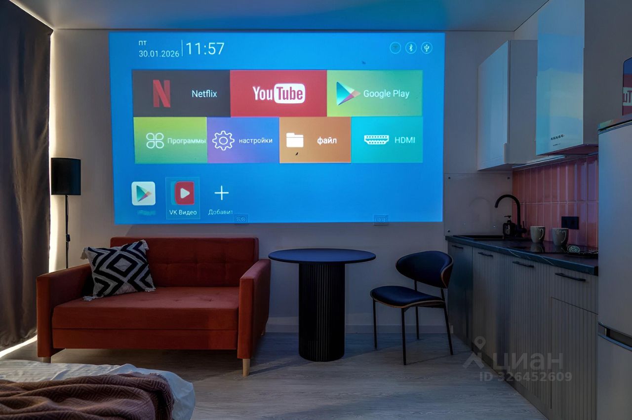 Подключен wi-fi и телевидение, установлен проектор - можете менять место просмотра на свой вкус.