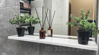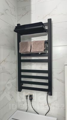 В ванной стиральная машинка с функцией сушки (2 в 1), электрический полотенцесушитель, шкаф-пенал и тумба под ракоаиной.