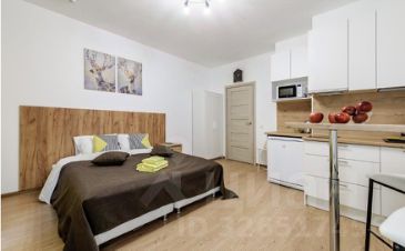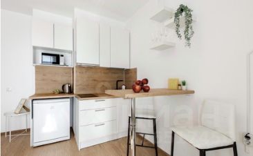 - Кухонный гарнитур с варочной поверхностью, холодильником, микроволновкой, чайником, набором посуды для готовки и сервировки