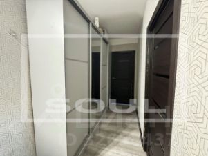 Мебель: удобный диван в гостиной и большой встроенный шкаф для вещей.