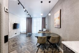 Кухня-гостиная: Светлое и просторное сердце квартиры, где легко разместится обеденная группа и мягкий уголок. Идеально для вечеров в кругу семьи и дружеских посиделок.