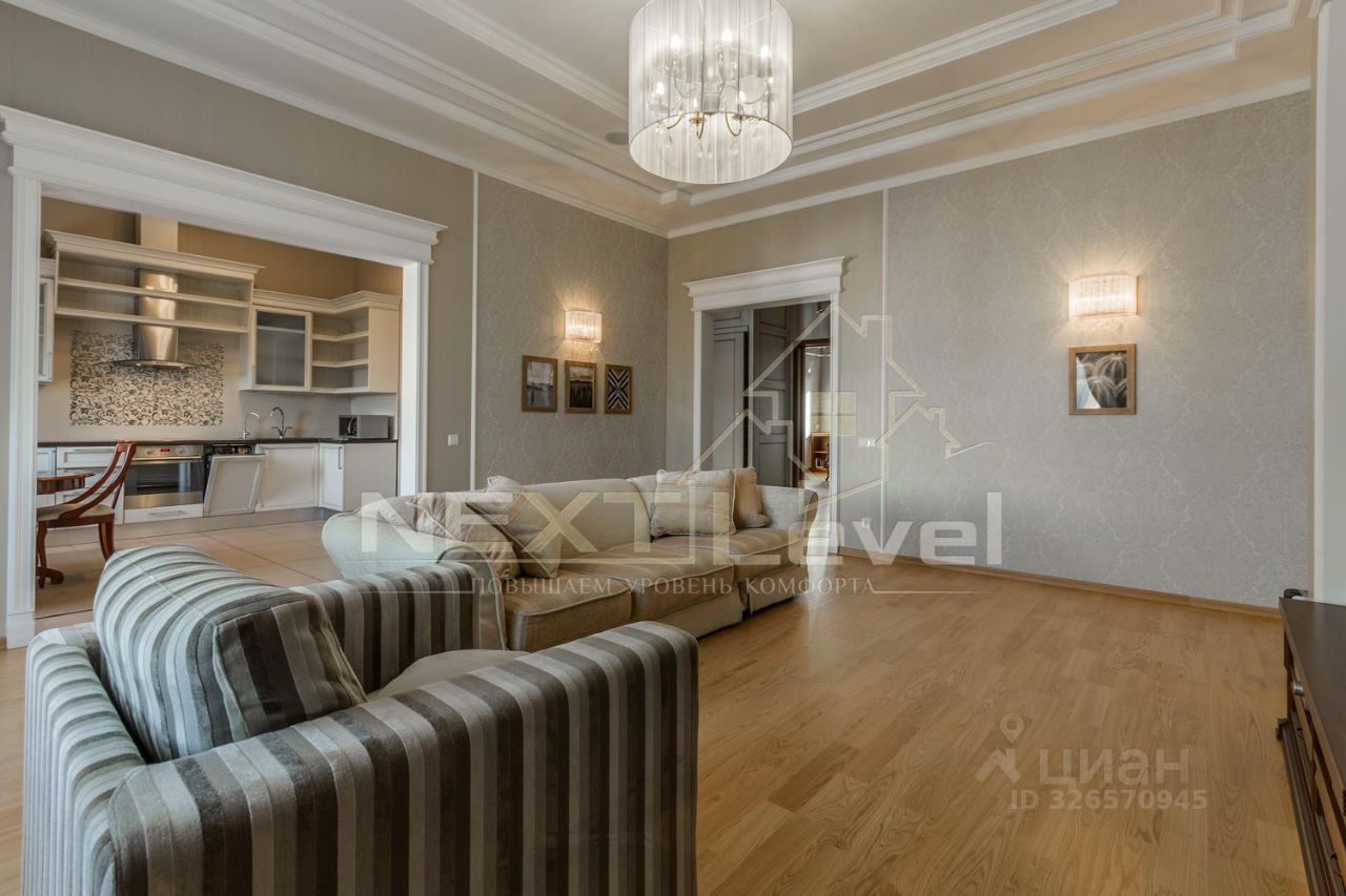 Квартира общей площадью 130 кв..м.с высотой потолков 4 метра, в современном элитном жилом комплексе. Двусторонняя светлая квартира. Гостиная, кухня через арку, прихожая, две спальные комнаты (во второй есть уже кровать), два санузла.