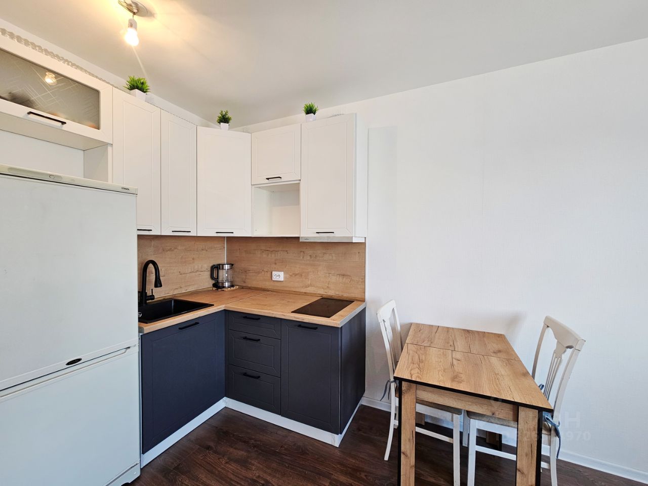Удобная кровать с ортопедическим матрасом, комод, журнальный столик, встроенный кухонный гарнитур с варочной поверхностью, вытяжкой, двухкамерным холодильником, электрочайником, обеденный стол, стулья.