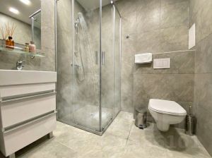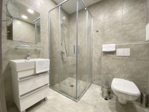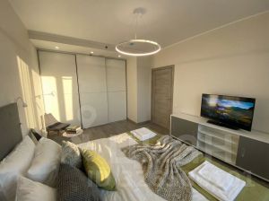 Квартира отличается дизайнерским ремонтом, что придает ей современный и стильный облик. Здесь есть все необходимое для комфортного проживания: холодильник, телевизор и стиральная машина. В комнате и на кухне имеется мебель, поэтому можно сразу заехать и начать жить. Санузел совмещенный, оборудован душевой кабиной, что создает дополнительное удобство.
