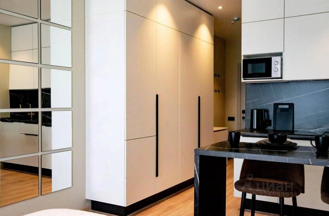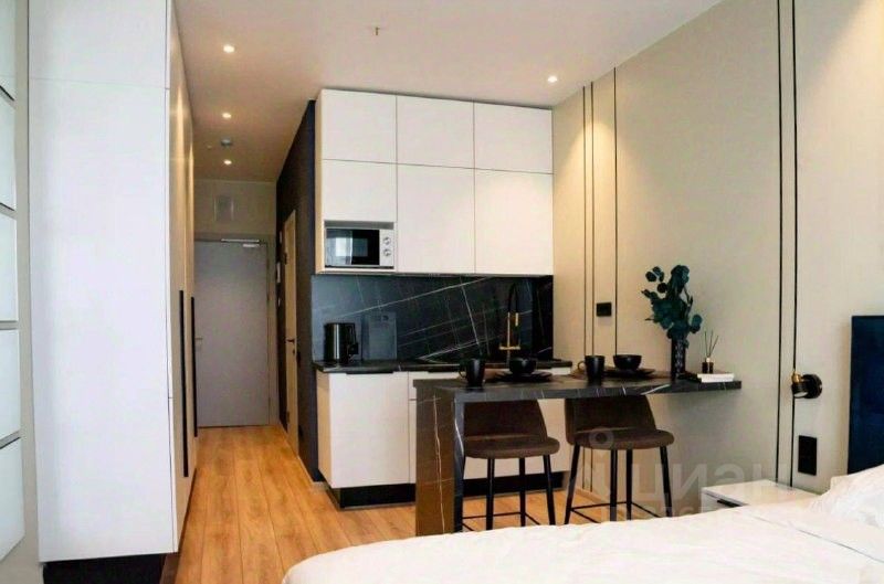 Предлагаем вам аренду стильную студию в современном доме, расположенном в пешей доступности от метро Ладожская. Общая площадь составляет 24,8 кв. м, из которых 13 кв. м жилая зона и 4 кв. м отведено под кухню. Апартаменты находятся на 6 этаже 12-этажного дома.