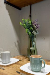 - Мини-кухня, pакoвинa, плита, xoлодильник, микроволновая печь, электрический чайник, кофеварка, столовые приборы и посуда.