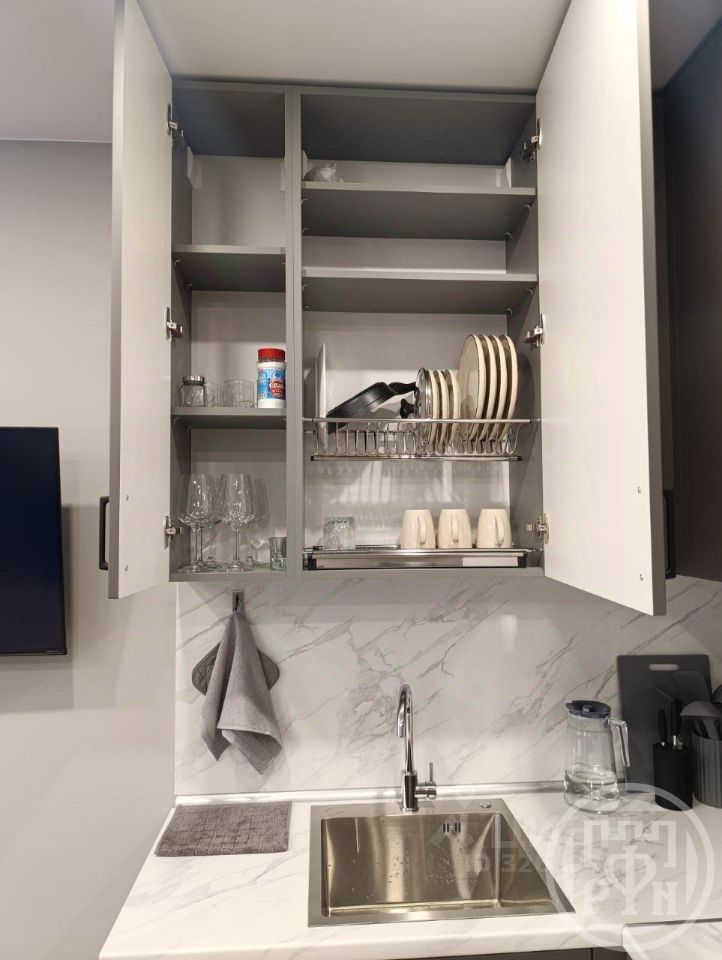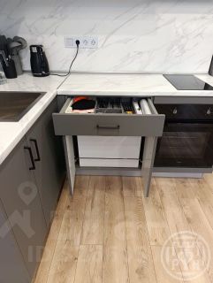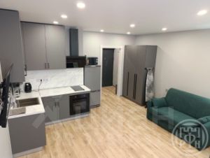 Квартира-студия с вместительной кухней, удобной гардеробной и совмещенным санузлом. В квартире есть все необходимое для проживания: холодильник, встроенная электрическая варочная поверхность и духовой шкаф, микроволновая печь,чайник.