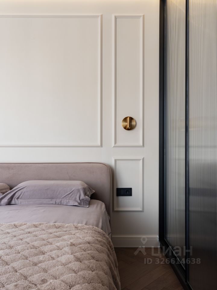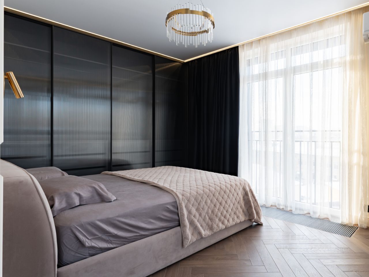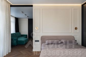 Спальня — отдельное, тихое пространство для отдыха. Установлена полноценная кровать с мягким изголовьем и премиальным ортопедическим матрасом размером 180200 см, обеспечивающим комфортный сон, а также встроенная система хранения во всю стену с затемнёнными фасадами. Большие окна обеспечивают хорошее естественное освещение, плотные шторы позволяют полностью затемнить помещение. В спальне также установлен кондиционер.