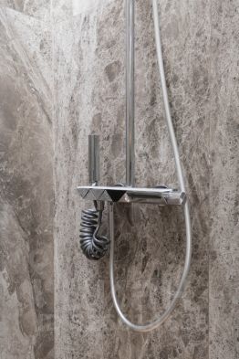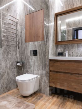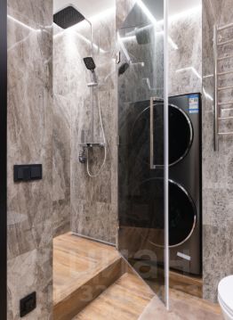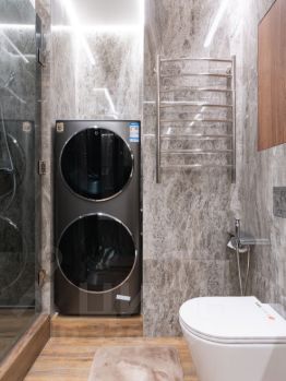 Просторный санузел выполнен в современной отделке: крупноформатная плитка, встроенная подсветка, качественная сантехника. Предусмотрены ванна и душевая зона со стеклянным ограждением, тёплый пол. Отдельно организована прачечная зона — установлены стиральная и сушильная машины, встроенные в интерьер.