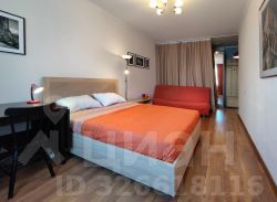 В комнате двуспальная кровать (ширина 160 см) с ортопедическим матрасом. Стол, диван, торшер. Есть большой шкаф-купе.