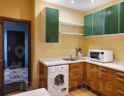 В кухне холодильник, электроплита с керамической варочной поверхностью и духовкой , микроволновая печь, стиральная машина. Стол и стулья.