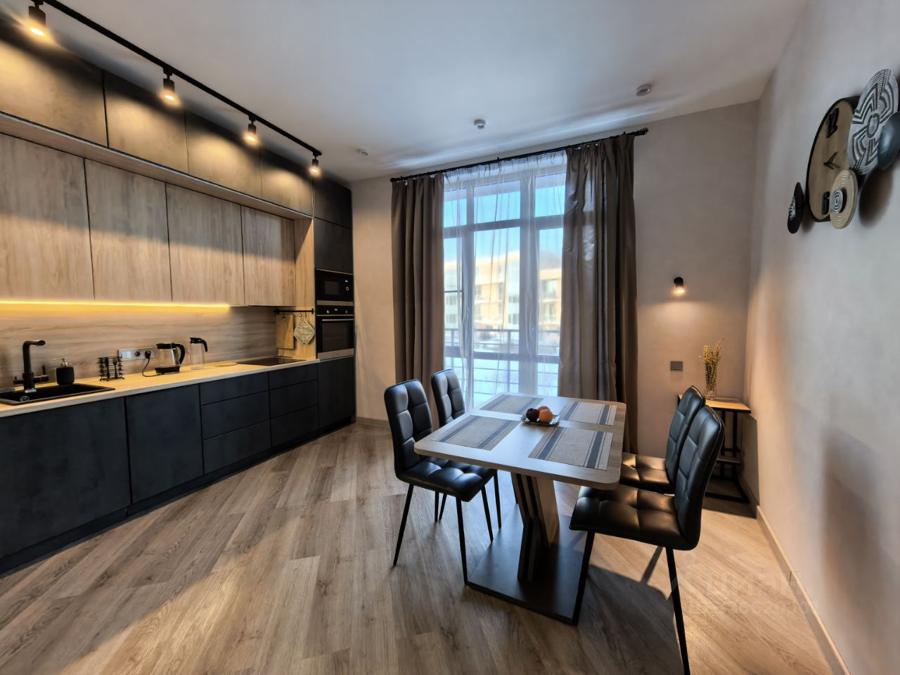 Кухня-столовая 15 м кв. оборудована современной техникой: встроенный двухкамерный холодильник, посудомоечная машина, варочная индукционная панель, вытяжка, духовка, встроенная СВЧ. В наличии посуда и столовые приборы. В зоне столовой: удобный раскладной стол, комплект из 4 стульев, ЖК смарт-телевизор, приставной столик, настенные часы.