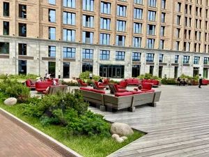 На 1-м этаже дома находится рецепшен с администратором, к которому можно обращаться по всем вопросам (24часа). Вся территория находится под видеонаблюдением и круглосуточной охраной. Во дворе есть детская площадка, ресторан, кафе, терраса с диванами и столиками, фитнес-клуб.