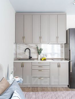 Кухня со всем необходимым (холодильник,варочная панель, духовой шкаф, микроволновая печь, чайник, а так же посуда, приборы )