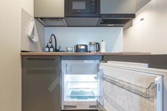 - В кухонной зоне: микроволновая печь, плита, холодильник, чайник, посуда и столовые приборы на любой случай. Чай, кофе, сахар, соль, конфеты.