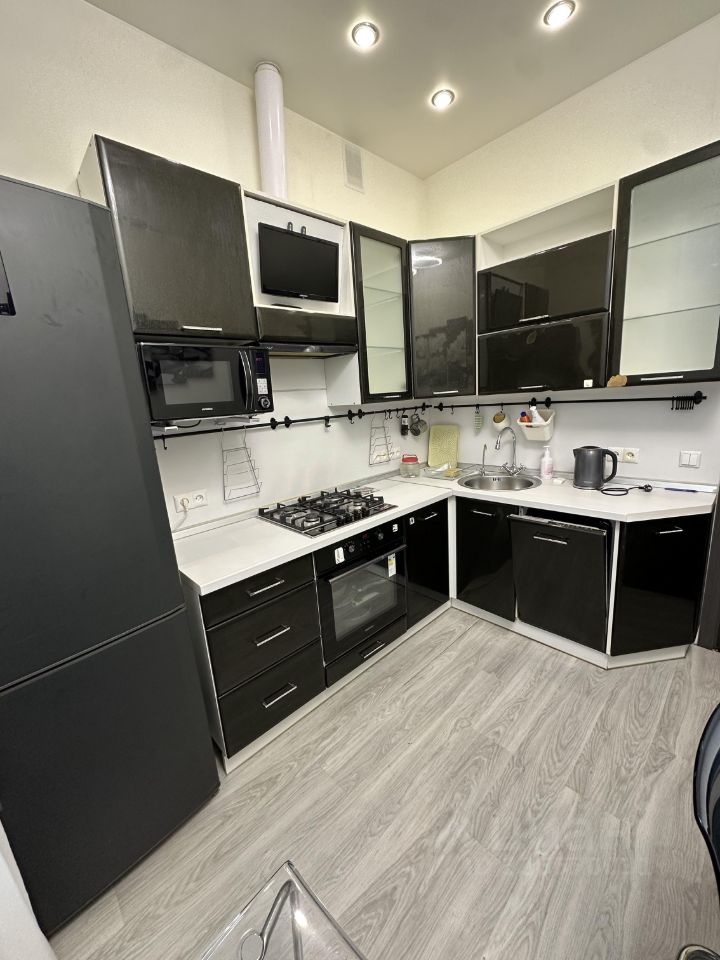 Кухня просторная, площадью 12 м², оборудована современной техникой: холодильником, плитой и микроволновой печью. Из мебели имеется удобный шкаф-купе и обеденный стол. Ванная комната и туалет раздельные, оформлены в светлых тонах с декоративными элементами.