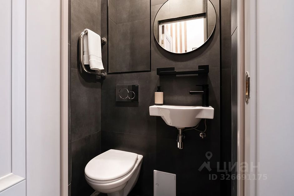 совмещенный санузел: туалет, раковина, зеркало, душевая, полотенца