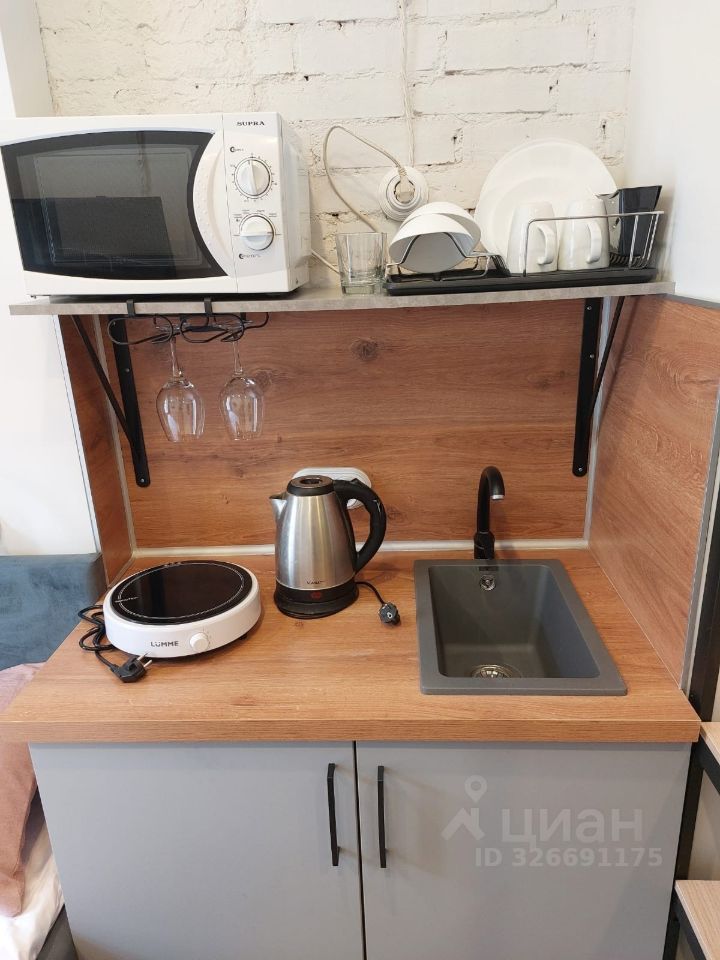 Студия оснащена мини кухней, где есть вся необходимая посуда и столовые приборы. Вы сможете приготовить себе вкусный завтрак или ужин, не выходя из дома.