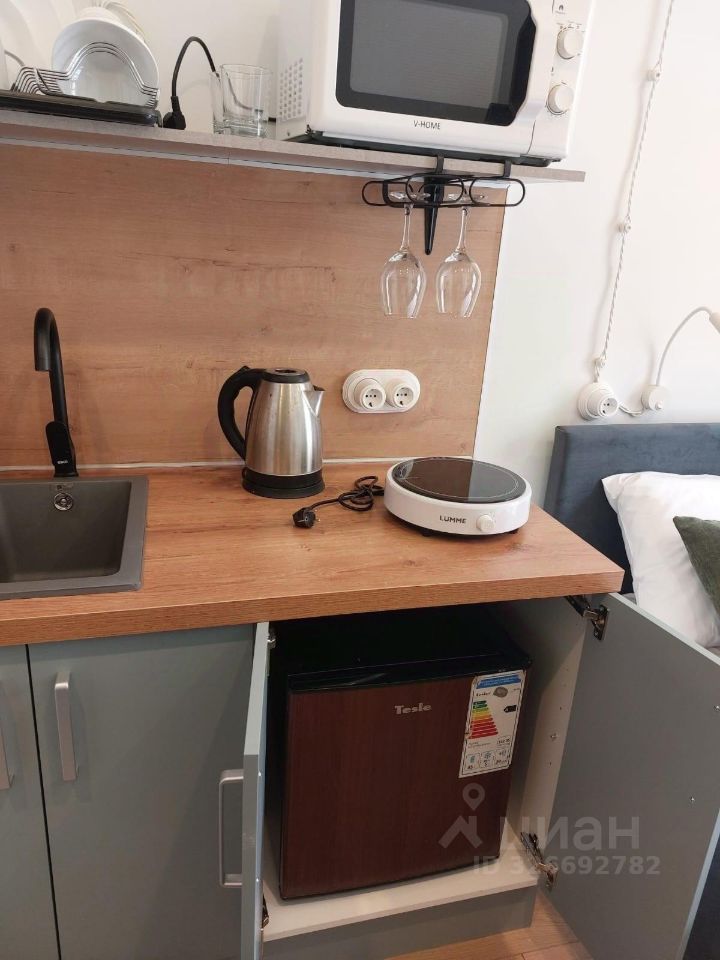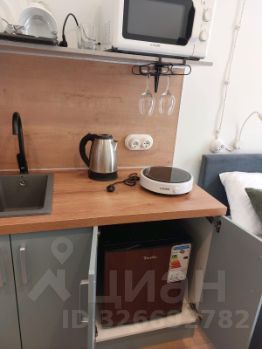 Студия оснащена мини кухней, где есть вся необходимая посуда и столовые приборы. Вы сможете приготовить себе вкусный завтрак или ужин, не выходя из дома.