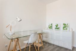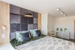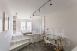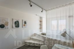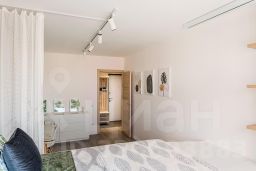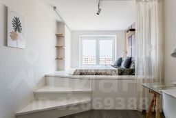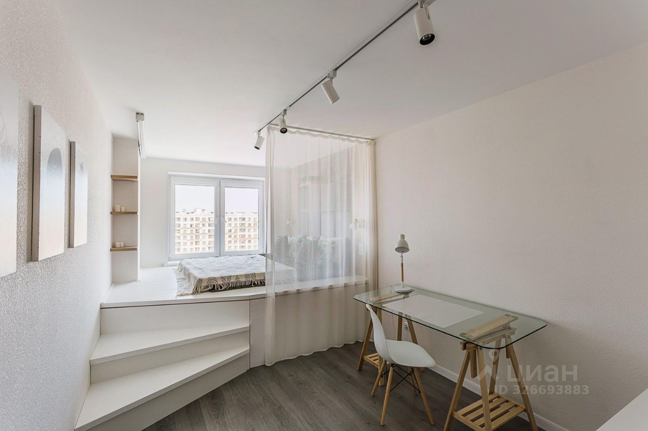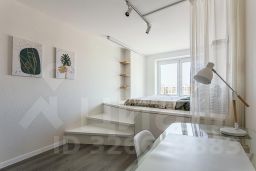 В комнате по индивидуальному заказу сделан подиум с двуспальным ортопедическим матрасом, экраном и полкой для проектора, продумано освещение. Оборудовано удобное рабочее место. Есть отдельная гардеробная, под подиумом много места для хранения вещей.