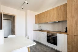 Кухня со встроенным холодильником, посудомоечной машиной, варочной поверхностью и духовым шкафом. Из кухни выход на большую лоджию.
