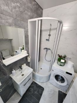 Современный санузел с душевой кабиной и стиральной машиной;