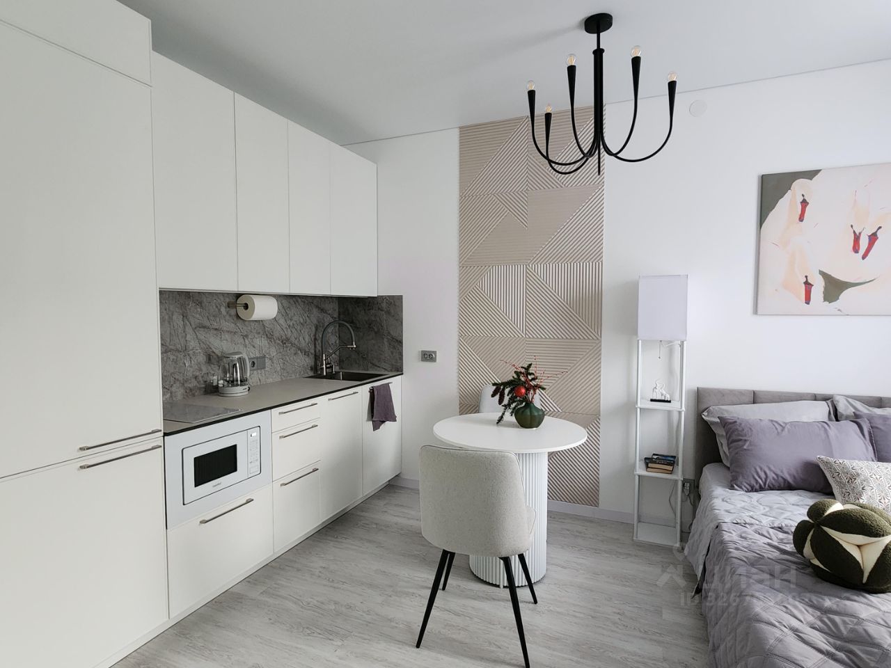 Стильная, уютная и современная квартира-студия с дизайнерским ремонтом в светлых нейтральных тонах в доме комфорт класса.Пространство продумано до мелочей и создаёт ощущение уюта, света и комфорта