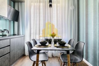 Авторский ремонт и дизайнерская мебель высокого качества. Особое внимание уделено комфорту: ортопедический матрас Askona и просторный диван-кровать (3.2 м).