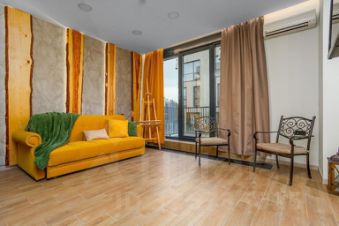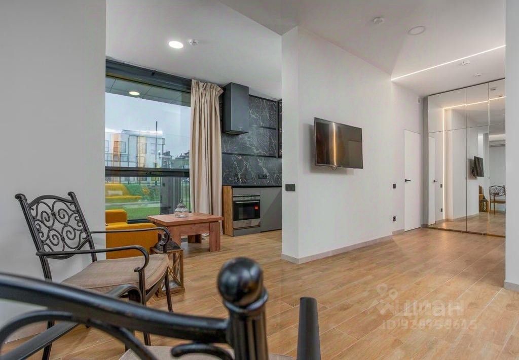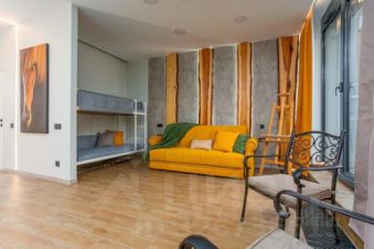 В апартаментах выполнен качественный дизайнерский ремонт. Много естественного света, высокие потолки, кирпичные стены, трубы, натуральные материалы, приточно-вытяжная вентиляция, панорамное остекление (окна в пол), кухня-гостиная с обеденной зоной полностью оснащена техникой, стильной мебелью, уютным диваном, душевая с с/у, терраса и балкон.