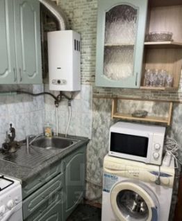 Кухня компактная, площадью 5 м², оснащена газовой плитой, микроволновой печью и стиральной машиной. Санузел совмещённый, оборудован всем необходимым.